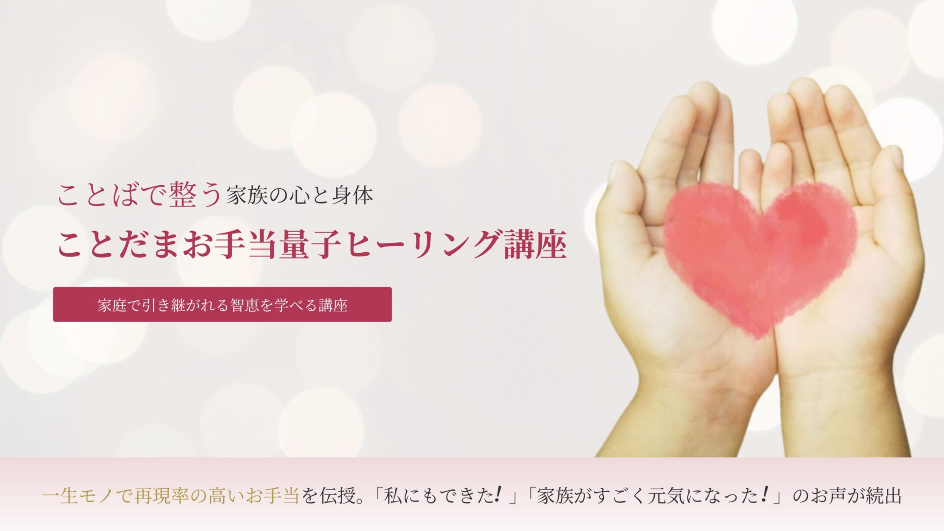 「ことだまお手当講座」は、言葉のチカラを活用して量子レベルで身体と心の調整をすることが学べる講座です。再現性が高く、日常やお仕事で取り入れやすいと多くの方にご好評いただいております。